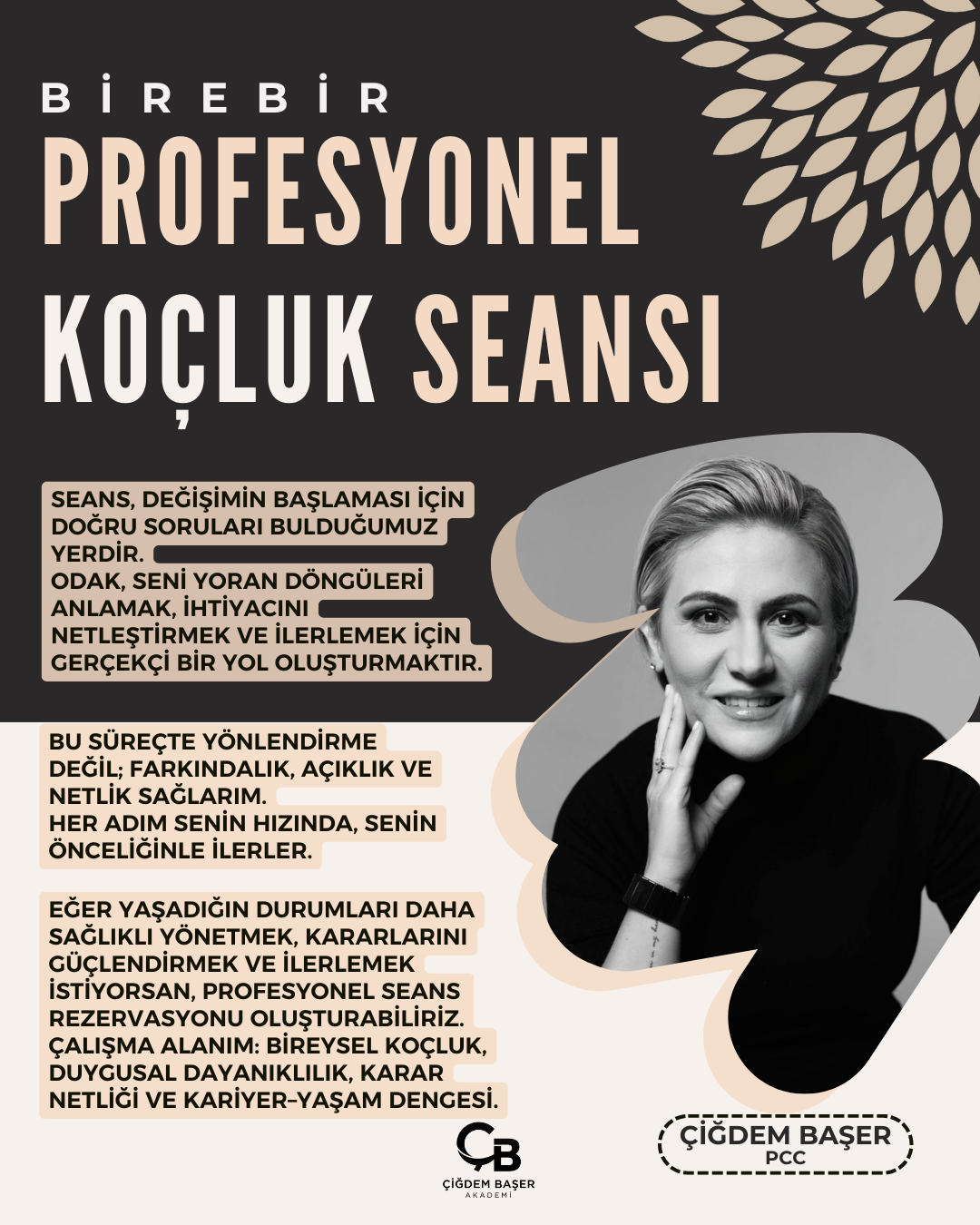 Çalışma alanım: bireysel koçluk, duygusal dayanıklılık, karar netliği ve kariyer–yaşam dengesi.